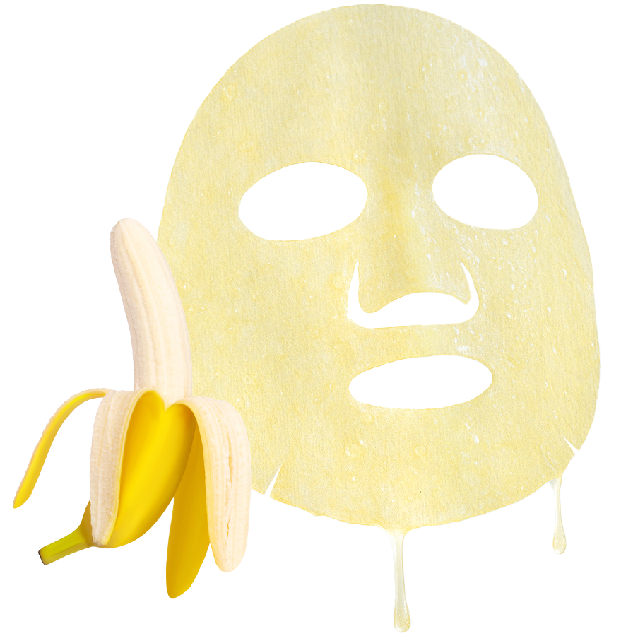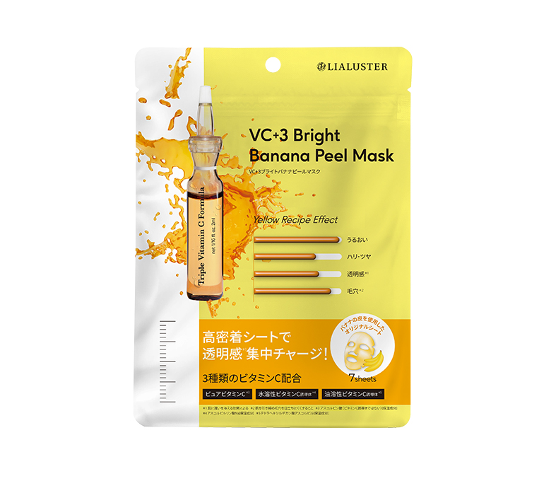 3種類のビタミンC*1やレチノールと*2、フルーツ由来成分配合のエッセンスとバナナピールを混ぜ込んだオリジナルシートでくすみ知らずの透明感*3肌へと導きます。